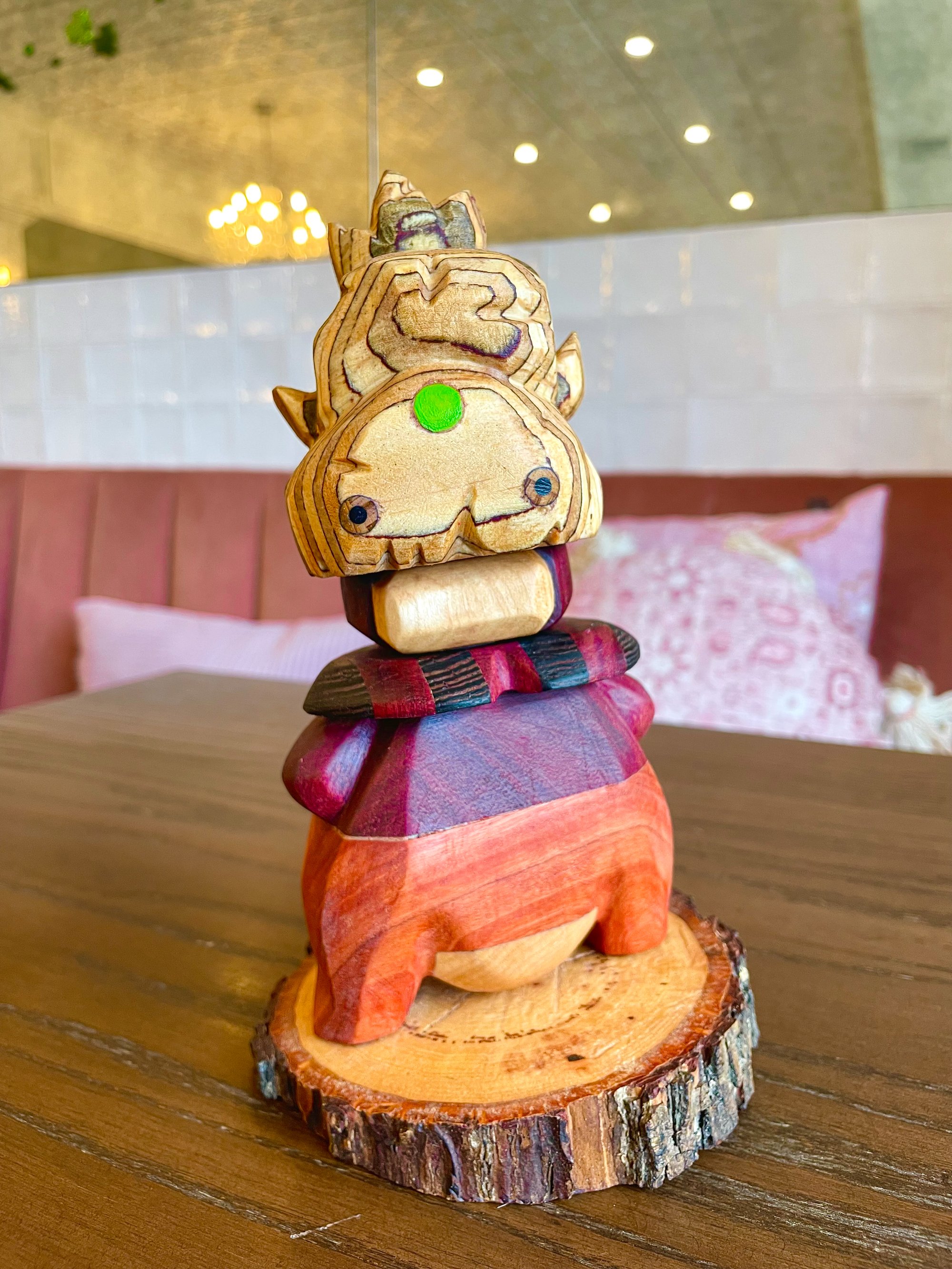 Stylized sculpture of Galarian Slowking. Purpleheart, wenge, beef wood.